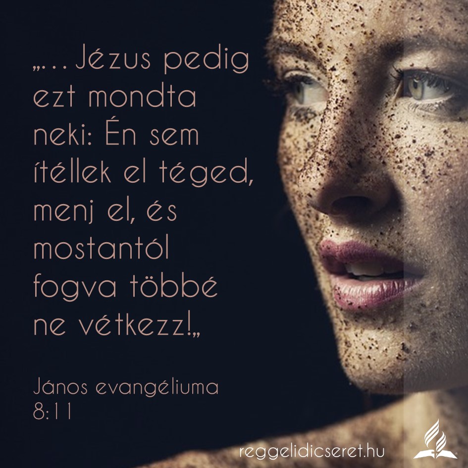 "Mikor pedig Jézus felegyenesedék és senkit sem láta az asszonyon kívül, monda néki: Asszony, hol vannak azok a te vádlóid? Senki sem kárhoztatott-é téged? Az pedig monda: Senki, Uram! Jézus pedig monda néki: Én sem kárhoztatlak: eredj el és többé ne vétkezzél!" (Ján.8.10-11.)